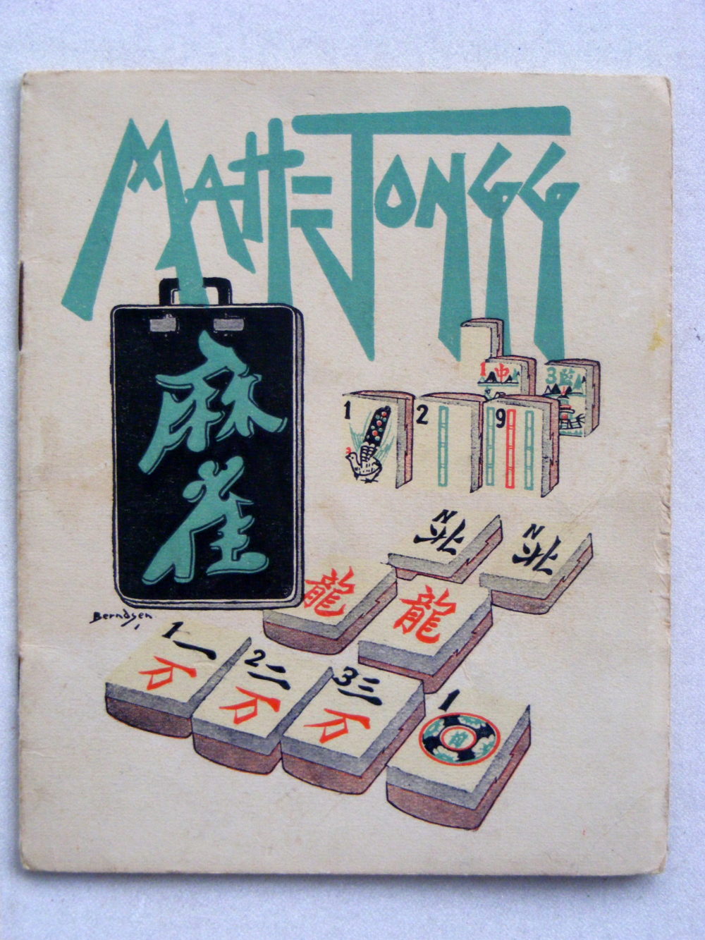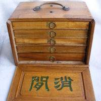 Hickson:- These unique sets are quite rare; the Dragon logo only appears on the card boxes with MAH JONG in stylised typeface. The booklet which accompanies most sets is by Bertram Hickson and belongs to the sets, as the unique tile set is illustrated in the booklet, hence my calling them Hickson. They come in either a flip-top cream cardboard box with 5 trays, or a wooden lift-front cabinet with 5 trays.