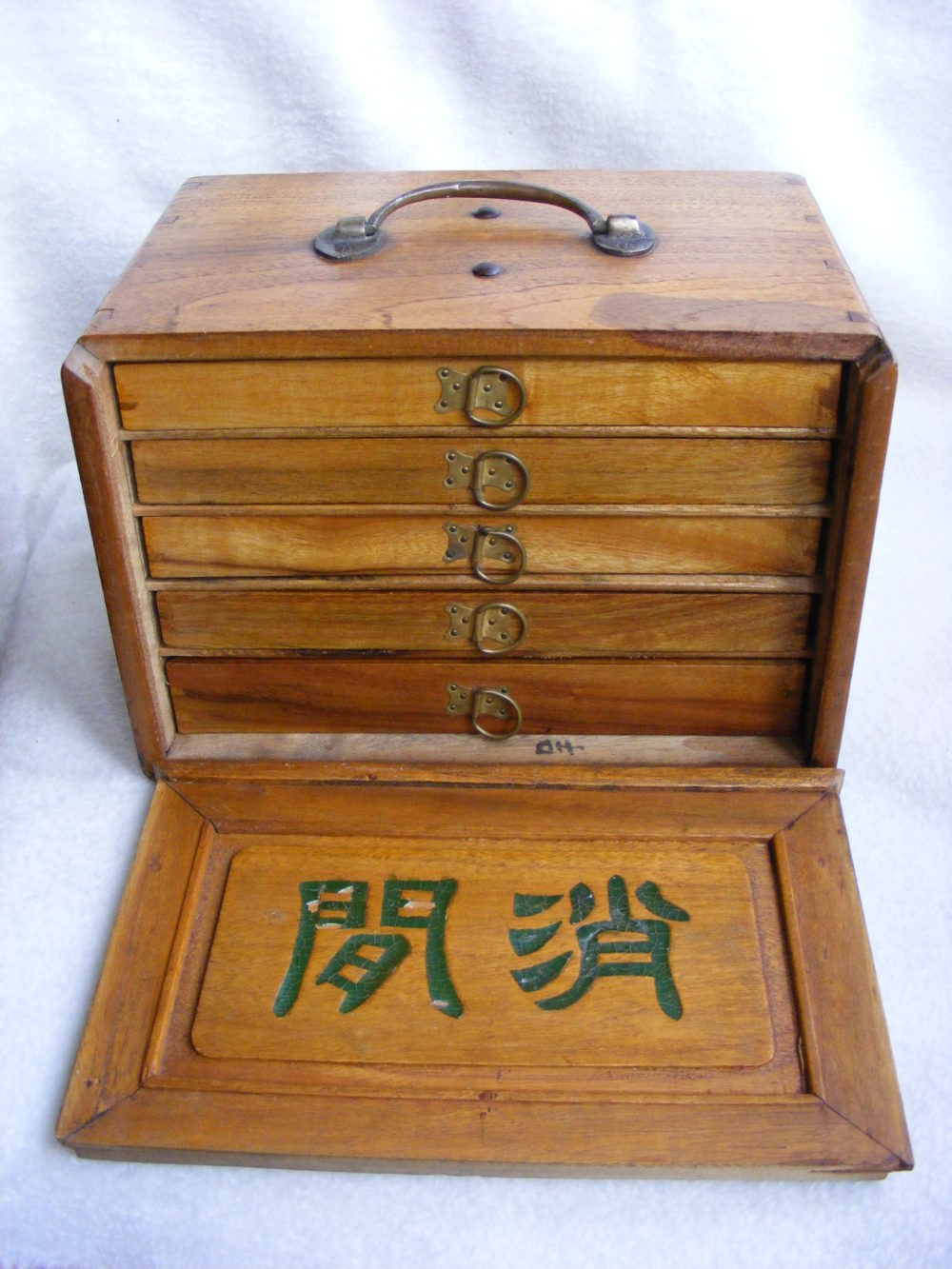 The box cleaned up nicely, measuring 240x165x170mm, with the usual sliding door revealing 5 drawers with brass flap pulls.