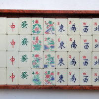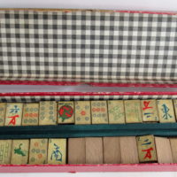 A cheap French pre-WW2 flat cardboard set measuring 315x215x40mm, with black-painted softwood tiles, printed acetate faces varnished with shellac, measuring 30x20x8mm, with casein counters & wind indicators and 4 paper-covered wood & card tile racks.
