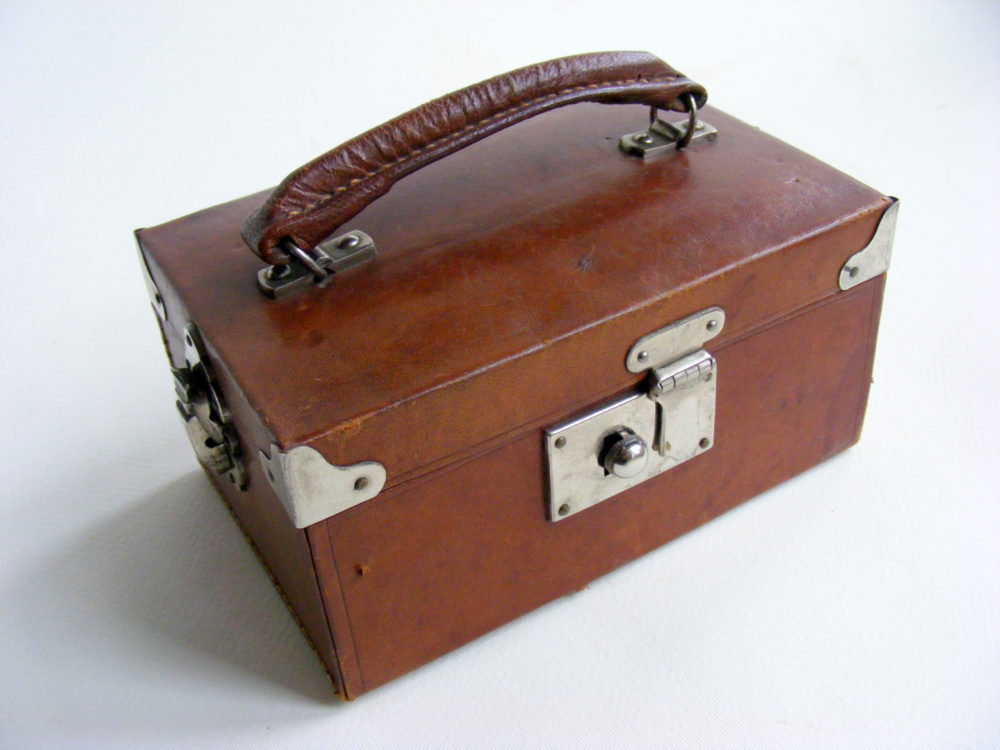 The box measures only 160x110x90mm made from wood covered in faux leather with appliquéd edges and corners to simulate brass.