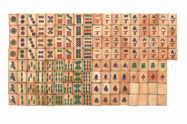 The Wilkinson tile set, courtesy of the British Museum, Department of Oriental Antiquities (with special thanks to Doctor Irving Finkle), London, was collected in Ningbo, China, 1889 – 1890. The tile set consists of the three Suits, the four Directions and the three Honours, commonly called the ‘Dragons’ in the West. The basic design on the tiles are; an abstracted form of a String of Cash on the number one String of Cash/’Bamboo’ (the late Japanese MJ Museum in Chiba interprets this figure as a ‘Mayfly’) plus pointed ‘leaf shapes’, or coils of string for the rest of the suit (as represented on a late Qing four-suited ma diao playing card set – see in the Money-suited Cards section); a simplified number one Cash/Circles showing two circles and four smaller circles inside the inner circle and multiple circles on the number 2 and 3 tiles with smaller, single circles the rest of that suit. All of these form an overall ‘engraving style’, and coupled with the overall group composition of the set constitute a ‘Tile Set Pattern‘. Sets with this design make-up were made perhaps into the 1930’s.
