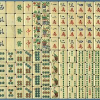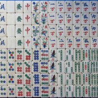 This set displays the standard Culin tile set pattern/form of the 3 suits, four Directions/'Winds', 3 Honours/'Dragons' and 4 Flowers and 4Seasons with an ornamental 1 Cash/'Circle' and a bird on the 1 SOC(String of Cash)/'Bamboo'. The Flowers sinograms, together with there pictorial representations in vases are li (plum), lan (orchid), ju (Chrysanthemum) and zhu (bamboo) together with various additional objects. These combinations will usually spell out a blessing. The Seasons sinograms are chun (Spring), xia (Summer), qiu (Autumn) and dong (Winter). The plants in vases with various objects are the Peony? (mu-dan), Lotus (lian-hua )with leaf, bud and flower , Plum (li) and Narcissus (shui-xian). Note the central right sub sinogram 'shu' (spear) in the green 'Dragon' sinogram rather than the earlier sub sinogram 'shi', meaning arrow.