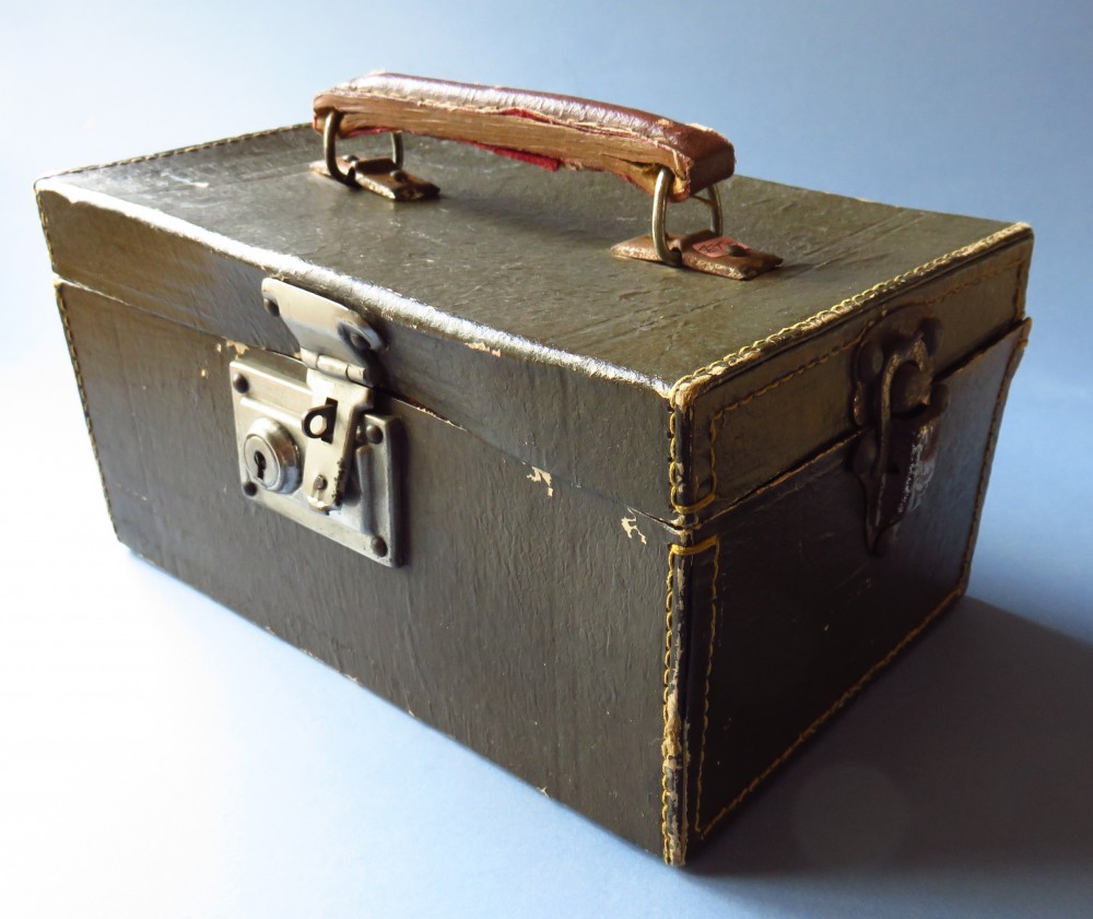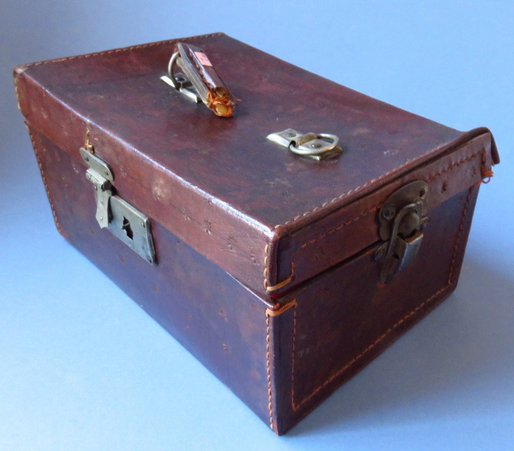 Leather boxes usually had handles fixed to the top which opened to reveal felt-lined or leather trays stacked one upon another. Some boxes had decorative patterns impressed into the leather.