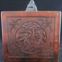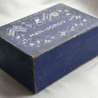Wooden cabinet containing five wooden trays for the tiles. Front sliding panel. The outer shell consists of side panels engraved and coloured showing various scenes. Wooden carved handle. Overall they produce a highly decorative effect. (Courtesy of the garland1943 collection).