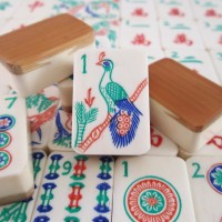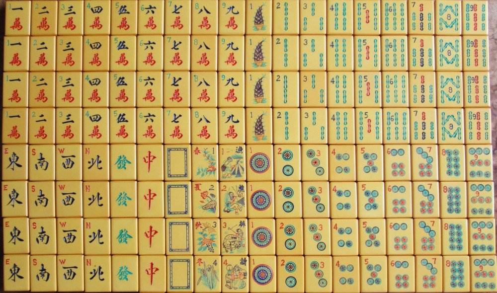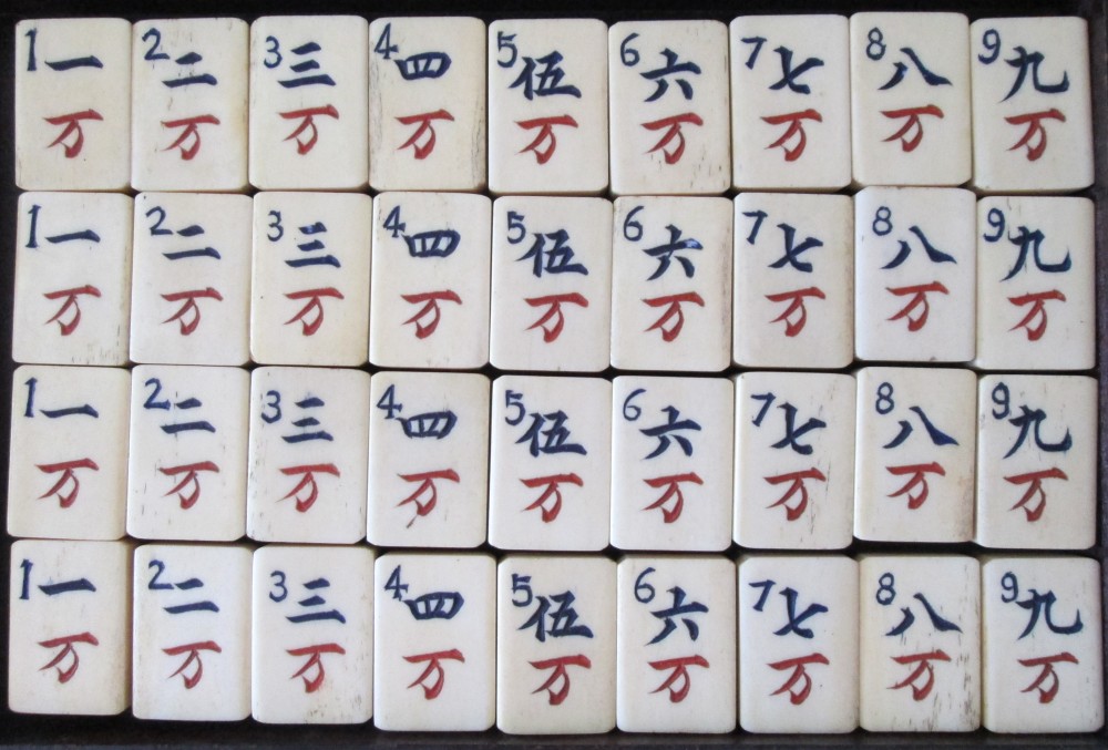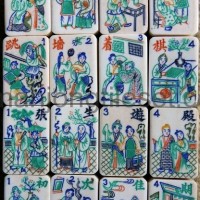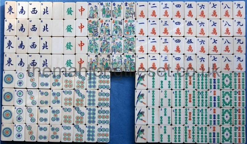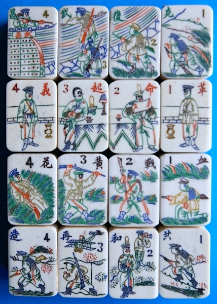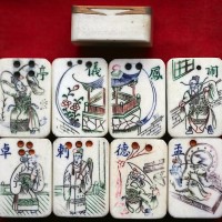 A decorative bone and bamboo set with sixteen Flowers/Seasons commonly seen in synthetic tile sets. The scenes show conflict from the Sino-Japanese War/WW2 which can give a period when this tile set was made. The Cash/'Circles' are decorated with Plum blossom and the number one SoC/'Bamboo' shows a bird standing on a citrus fruit called 'Buddhas Hand' (Citrus midica). It may represent wealth. The 'Bamboo' rods appear to show rounded ends. This form of rod is another type of pattern used for this suit and is more indicative of coins viewed at the ends of a string. (Courtesy of the garland1943 collection).