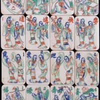 This set is the same style as the 'war-1' set, together with the same motifs. However it now has sixteen Flowers/Seasons showing figures in traditional costume. The first column reads; qin 'lute', qi 'chess', shu 'books' and hua 'painting' = the Four Arts of the Scholar. The second column reads; xiao 'leisurely', yao 'far' = "carefree" and kuai 'happy', le 'cheerful' = "happiness". Thus "carefree and happy". The third column reads; ?, ? 'beautiful clothing', ?, wu 'dance' = a Performance? The last column reads; fu 'good luck', lu 'promotion', shou 'long life', xi 'happiness' = four blessings. (Courtesy of the casity collection)
