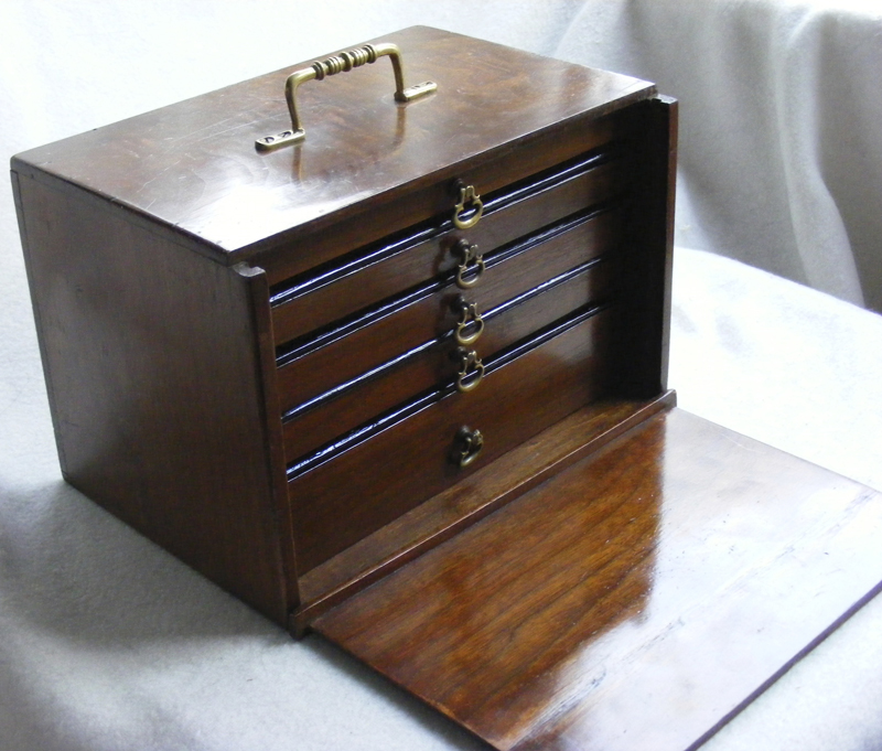 Wooden cabinet with a slide-up front, five wooden tile trays inside plus one metal handle (one missing). Fine bone marquetry on four sides. (Courtesy of the garland1943 collection).